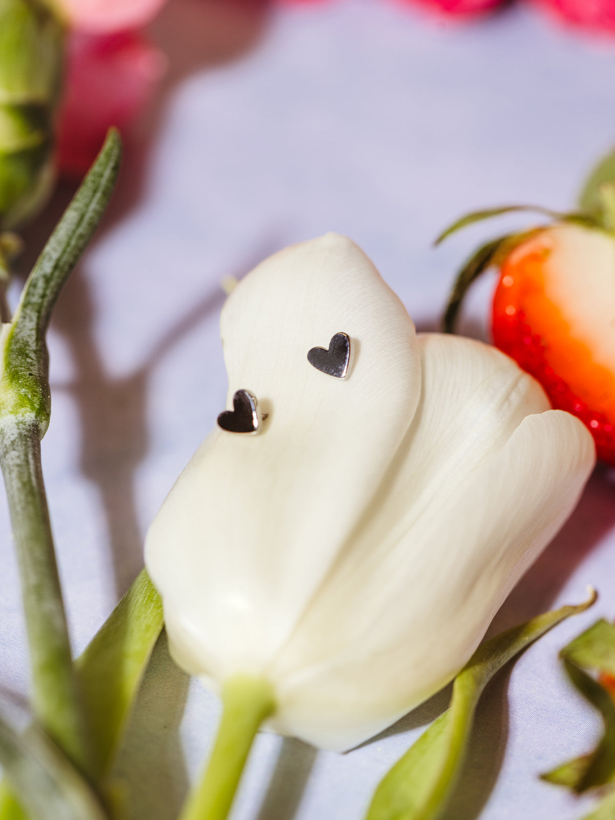 Pair of small silver heart stud earrings resting on a white tulip petal, surrounded by floral accents and a sliced strawberry.