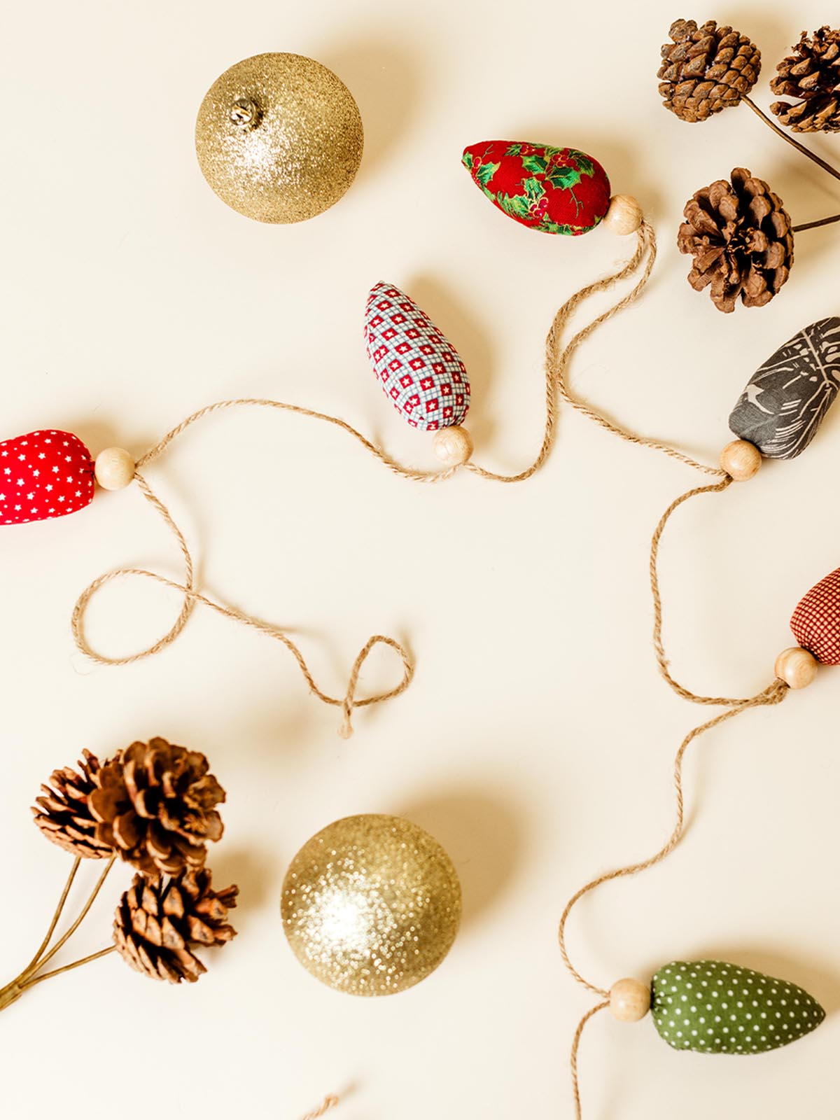 Handmade fabric Christmas lightbulb garland featuring colorful lightbulb-shaped fabric pieces and wooden beads, draped on a rustic wooden surface, adorned with a pinecone and frosted glass.