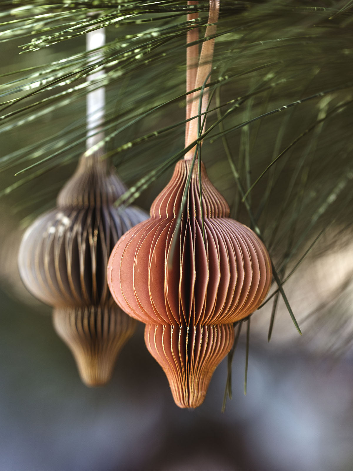 Add modern elegance to your Christmas tree, mantel, staircase, or holiday display with these paper honeycomb-tiered ornaments. Each ornament features a discreet magnetic closure for a sleek finish and a classic tiered shape in two contemporary, festive colors- gray or peach. Handcrafted by women in Bangladesh and India, these ornaments blend of sophistication and nostalgia and support dignified work, fair wages, and the fight against human trafficking.