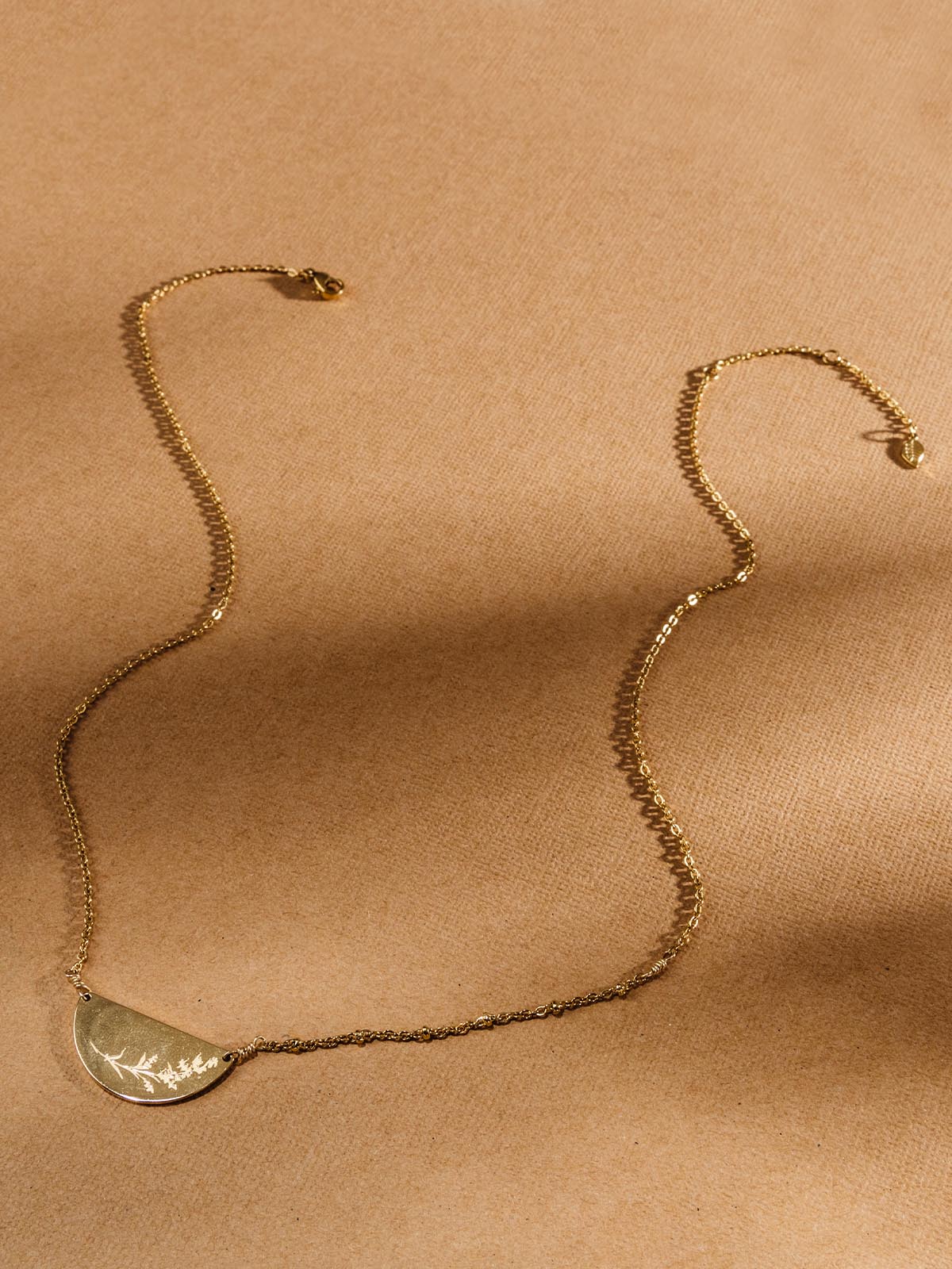 - 18K gold-plated stainless steel chain and semi-circle pendant with mustard seed engraving