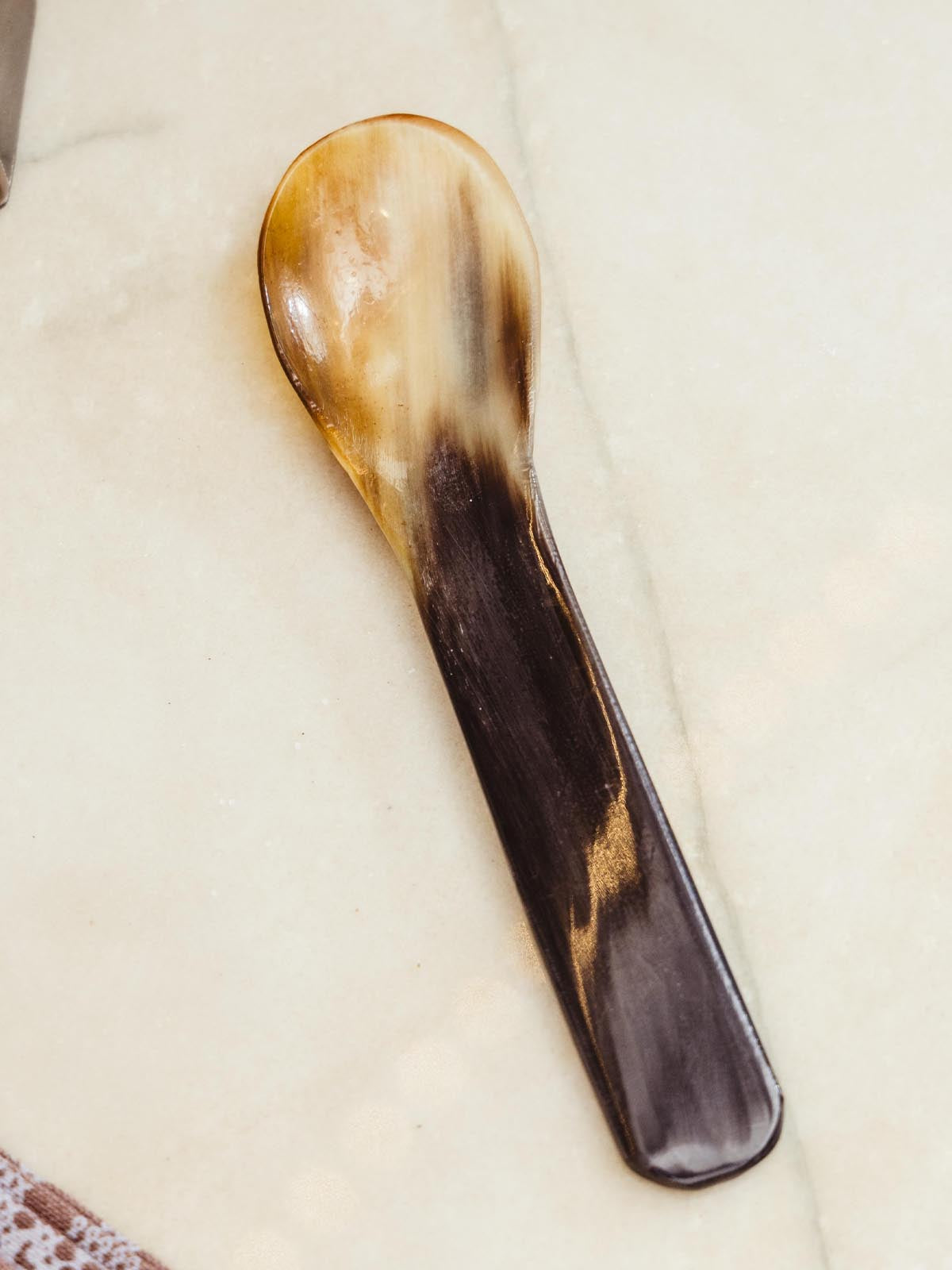 Short horn spoon on white counter top.
