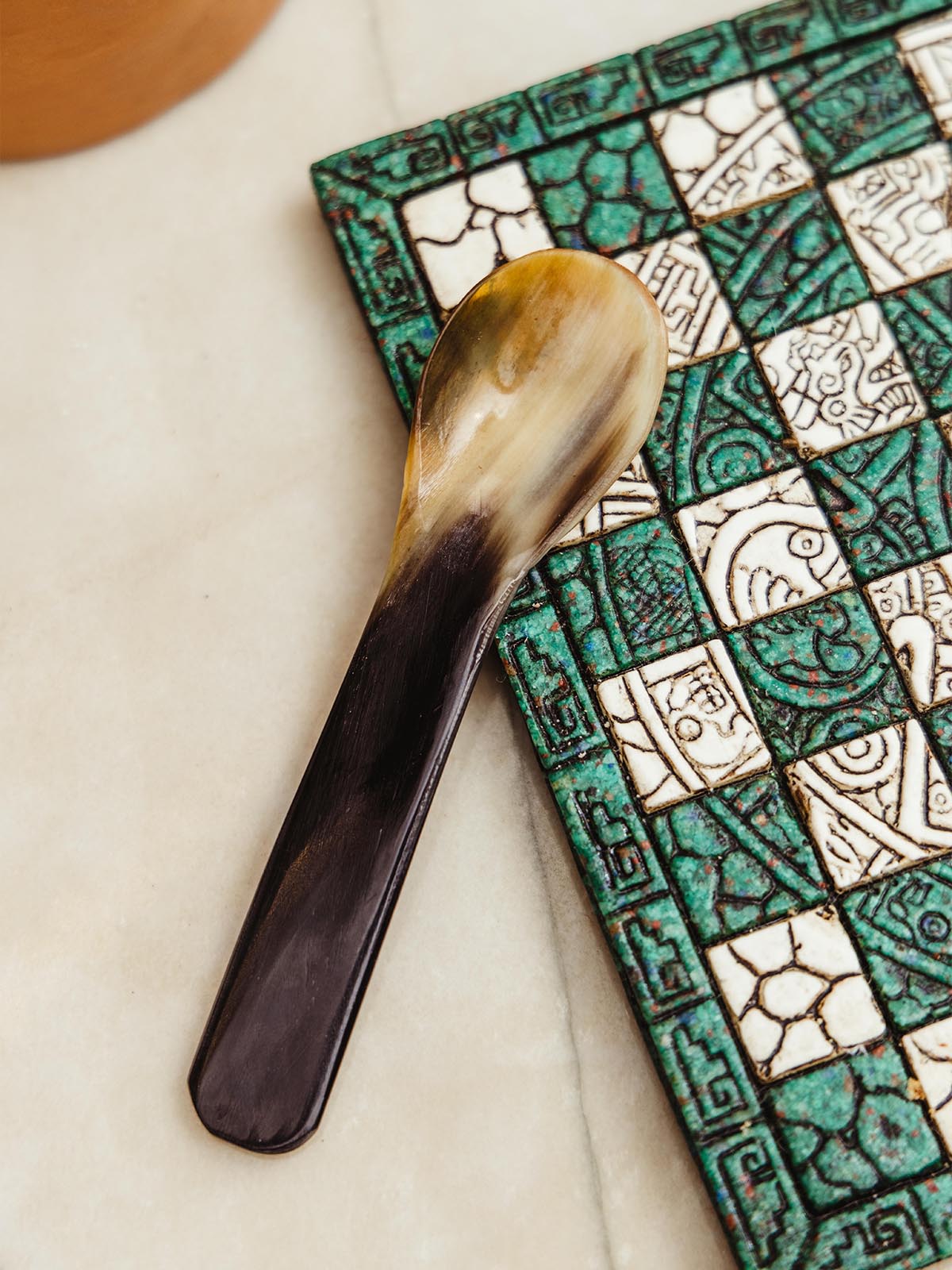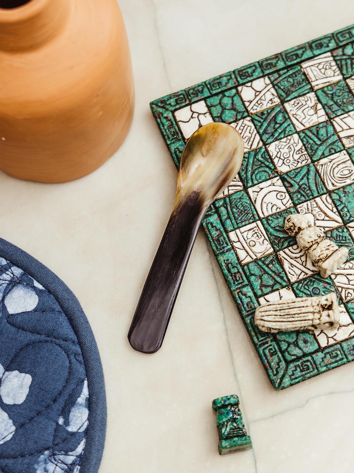 Short horn spoon on jade and white checker board on white counter top.